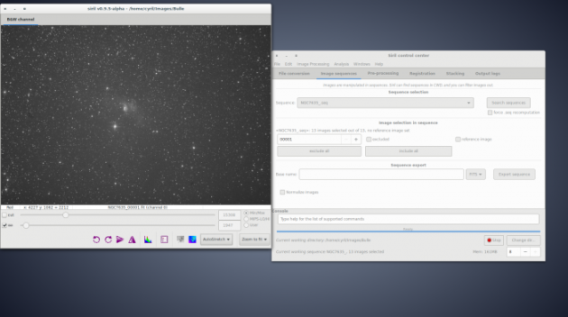 Quando la sequenza è caricata due finestre possono essere aperte: la finestra di controllo del frame grigio, sulla sinistra nell'immagine sottostante, e la finestra per la visualizzazione della composizione RGB, dietro alla finestra principale nell'immagine sottostante. Nel caso di immagini monocromatiche o file CFA, si aprirà solo la finestra del frame grigio.