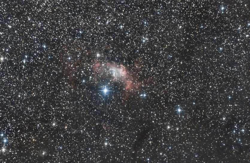 NGC7635NGC7635 (©Astro Romain, Processed by C. Richard) 119 raw images + darks/bias/flatsPre-processing avec Winsorized Sigma Clipping algorithm, background extraction, color calibration, midtones transfer function, green noise reduction et enhancement of saturation.