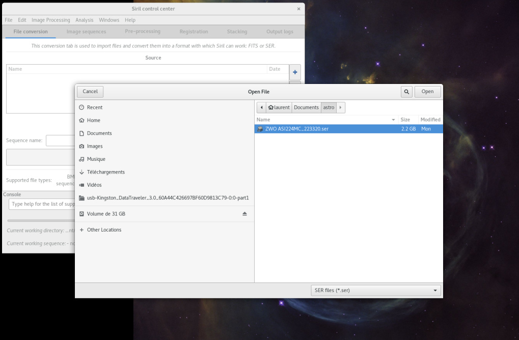 Use SER filesOpen the fileMenu File/Open FileSchermata121Select SER files (* .ser) from the dropdown menu2Click on Open once the file selected NotaThe SER files are converted on the fly in sequences